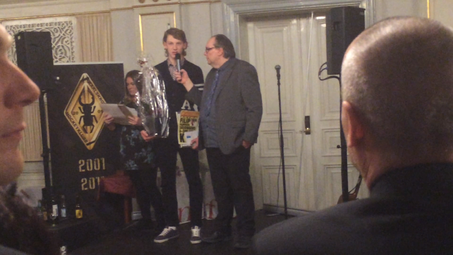 Filip Helmerson får sin utmärkelse och information om KHKarens stipendiefond